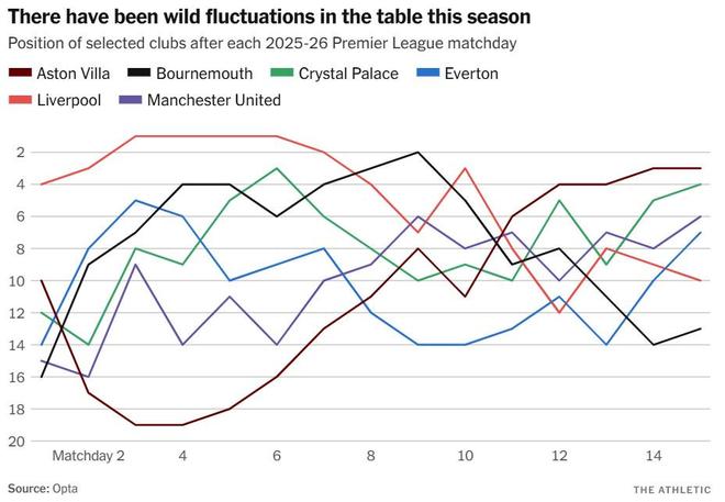 现在,在一连串出色的战绩之后(接下来10场联赛赢了9场),他们已被视为冠军挑战者。维拉在九月底还排在20队中的第19位——现在他们高居第三。本赛季没有其他球队经历过如此极端的联赛排名波动。